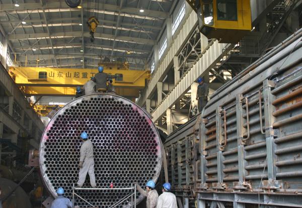 2011年元月3日,機(jī)械制造公司員工們?cè)趯挸髁恋膹S房?jī)?nèi)施工,制造加氫反應(yīng)器。2010年機(jī)械制造公司自行投資興建了制造面積達(dá)10000平方米的千噸級(jí)高壓重型容器車間。...